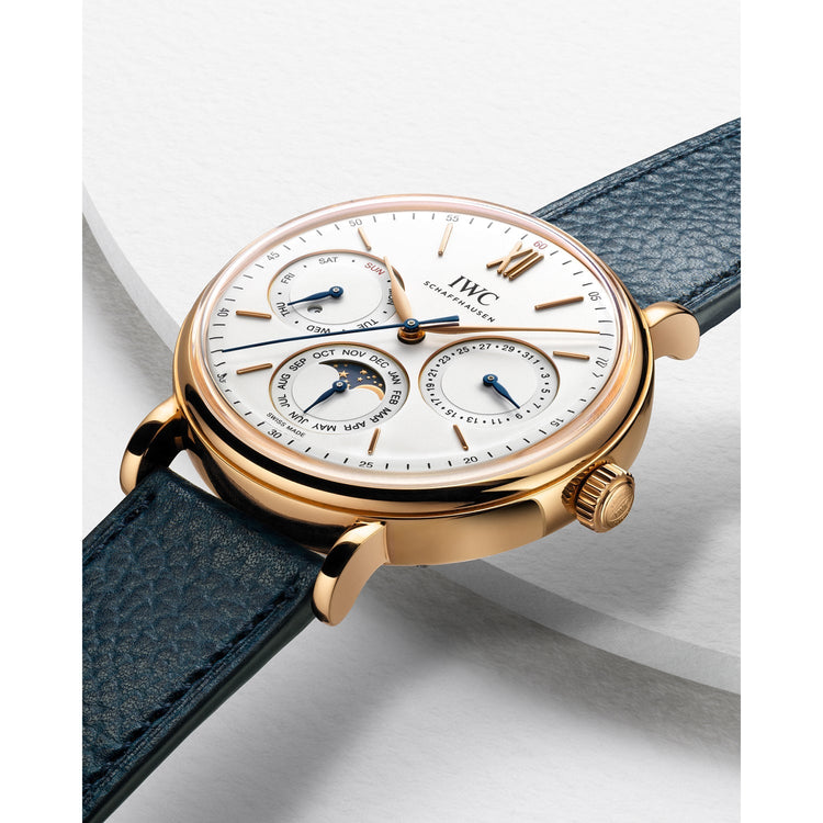 Over the past three decades, the Portofino watch family has established itself as one of IWC Schaffhausen's most successful collections and is equally popular with both men and women. The uncluttered dial with Roman numerals and simple hour markers is completed with slim feuille hands.